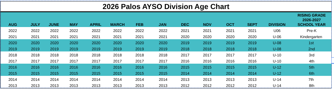 Palos AYSO allows players to play grade appropriate to play with their classmates. If the player's birthday falls outside of the above division age chart, please email Palos AYSO to transfer the player to the correct division.